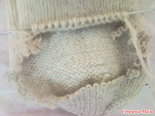 2) когда на двух спицах. С обеих сторон ряда оставляешь недовязанной одну петлю, и когда в середине вы провязываете 8-10 петель, то начинаете прибвалять так же по одной петле с обеих сторон ряда. Эта пятка с дырочками получаетсяпо бокам.