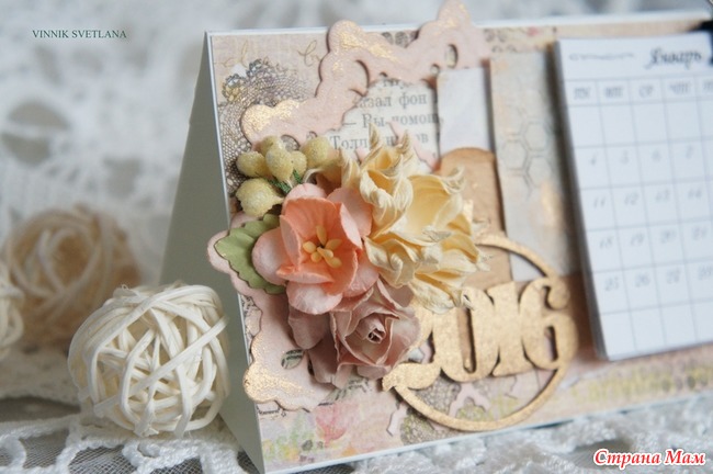 Всем добрый день. Как же я устала болеть!!! Надо же было подцепить гнойную ангину, да ещё перед самым Новым годом. Все намеченные планы рухнули. Сегодня шестой день болею, температура спала, решила успеть близким подарки доделать. Появился календарь. Использовала штампинг, пальчиковые восковые краски, и как всегда, цветочек ручной работы (большой жёлтый).
