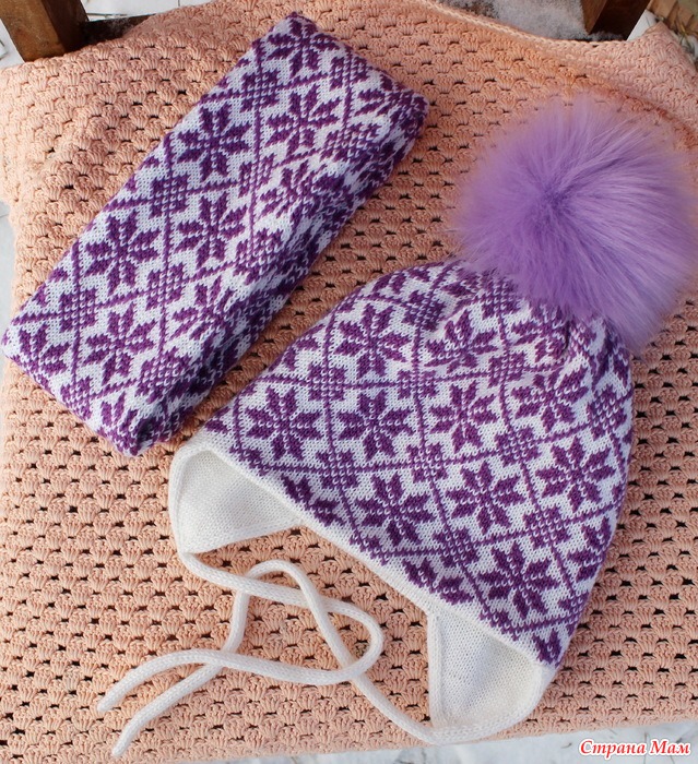 Добрый вечер, девочки. Моя первая работа в наступившем году и первая в технике жаккарда, первый блин, так сказать. Вязала из Лидии в 4 ниточки, ультрабелая и фиалка. Шапочка двойная, ещё флис добавлю, шарфик связан прямоугольником и сшит по краям, помпошка искусственная. Спасибо за внимание!