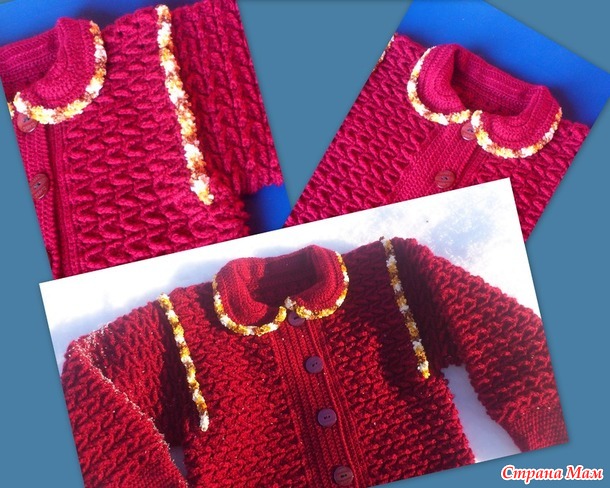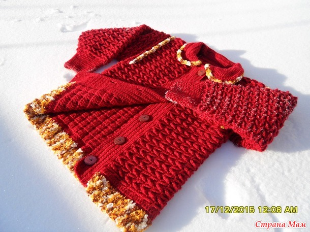 Теплая, плотная кофточка на холодные денечки связана для 5-летней Арины. Пряжа бордовая- семеновская Светлана, 250м/100г, полушерсть, крючок кловер2.25. Узор "прожорливый"- ушло 450г.