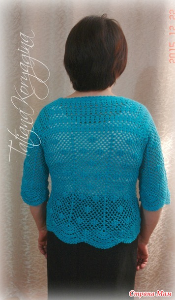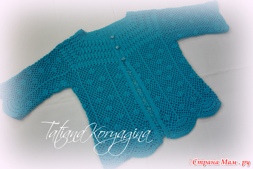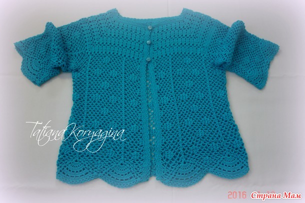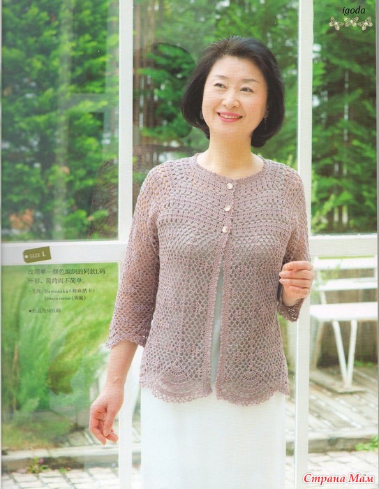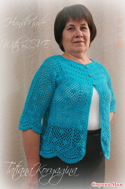 Решила я в подарок на день рождения мамы связать бирюзовый жакет. Мама пожелала на трех пуговицах и с рукавом 3/4. Основой для подарка послужил вот этот оригинал по азиатским схемам: