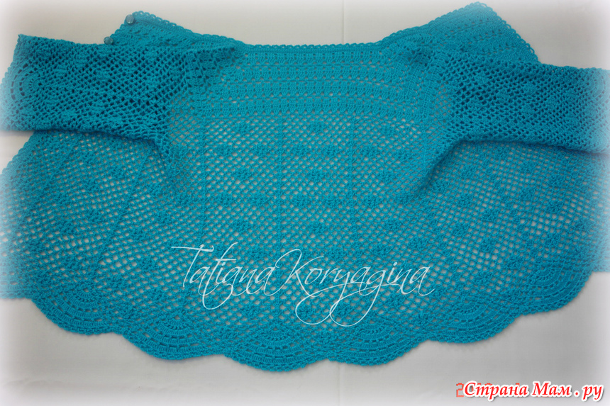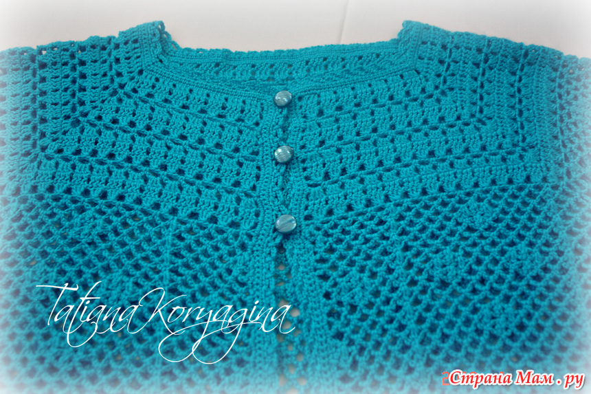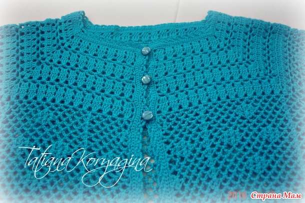 На рукавах набирала цепочку из 6 в. п., к концу рукава уменьшила до 5 в. п. Мама просила не суживать рукав (сначала связала как на схеме, с убавками, но рукав оказался узким), поэтому я просто уменьшила количество воздушных петель.