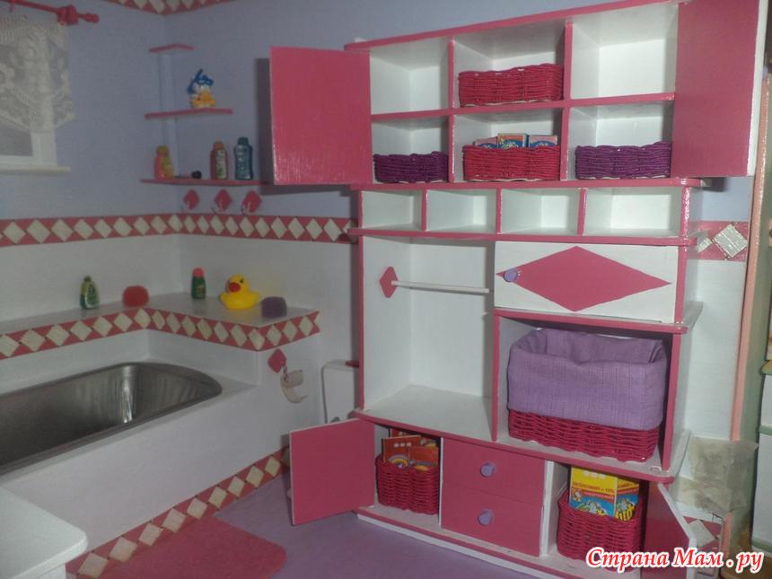 Комнаты. Рассчитывали для удобства игры дочки. Высота - 45 см. Ширина, наверное, зависит от вашей кукольной мебели - у меня кухня большая, ванная и столовая уже меньше. Вот с глубиной комнат мы перестарались - делайте меньше - у нас 50 см., лучше 40 см. и даже меньше.