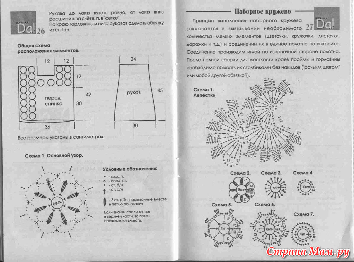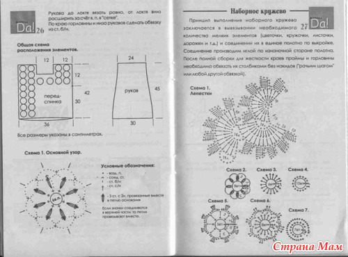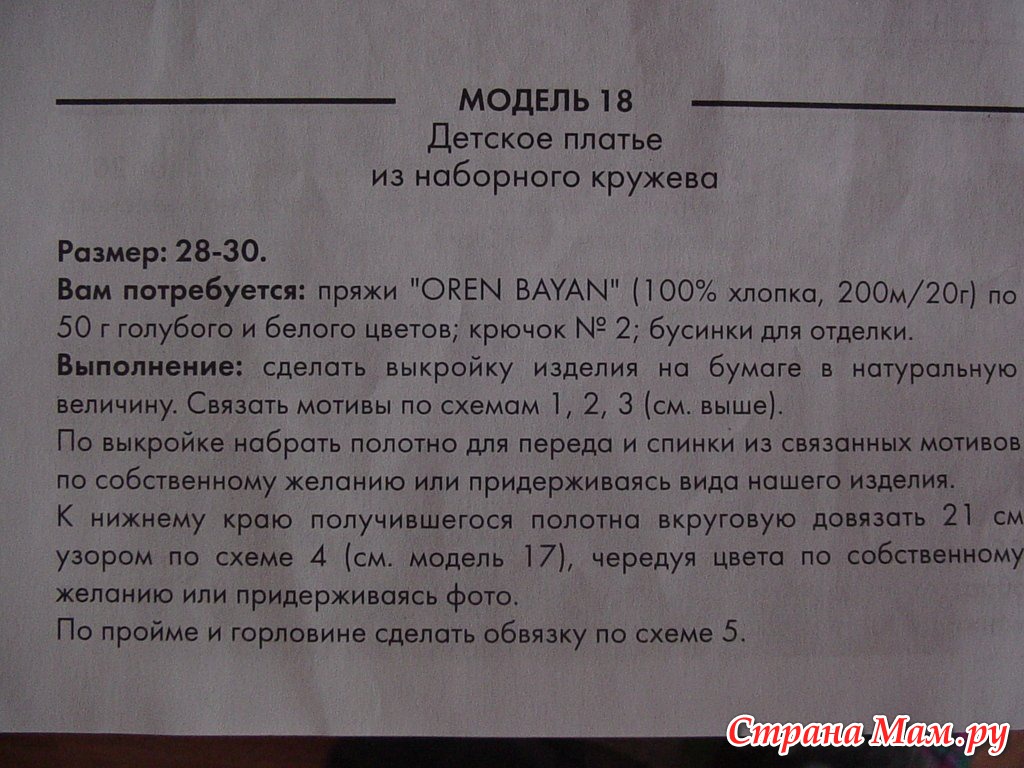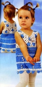 Платье для девочки связано крючком из наборного кружева. Принцип выполнения наборного кружева заключается в вывязывании необходимого количества мелких элементов (цветочки, листочки, дорожки и т. д.) и соединения их в единое полотно по выкройке.