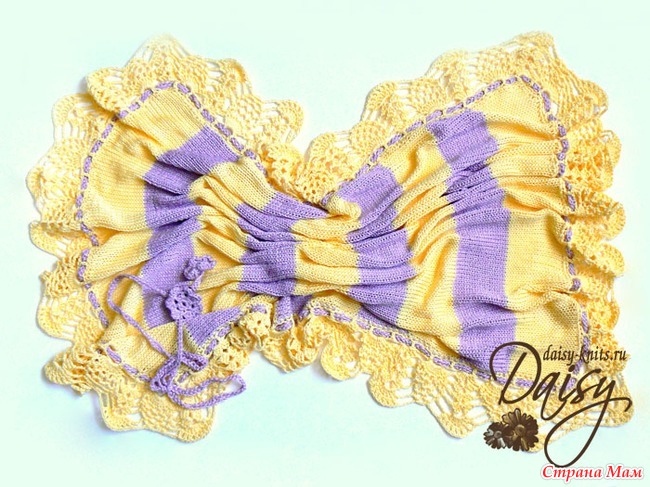кружевная кайма шириной 10 см придает законченный вид. На концах ленты