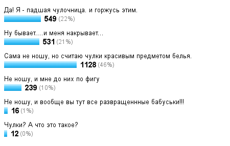 Ну так вот, к чему я все это! А давайте посчитаем, сколько нас здесь - "падших чулочниц", беспринципных женщин, попирающих моральные устои нации? Предпочитающих красивые ажурные резиночки колготным шовчикам, развратных сооблазнительниц? (Дальше не помню, что еще она несла, не записывала