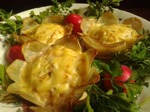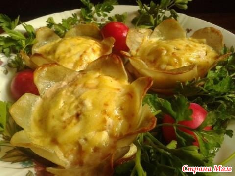 Взять формы для кексов, например, из фольги. Выложить картофельные пластины в виде лепестков по бокам и на дно формочки.