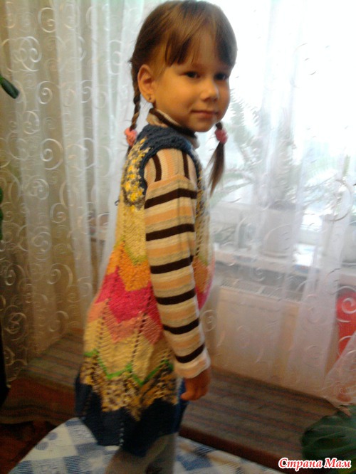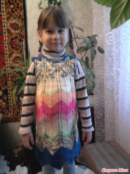 Сарафан: для того чтобы количество зигзагов не менять, но внизу юбочка была шире, просто в рапорте узора меняла количество лиц. петель между накидом и тремя вместе, начала с 7-ми петель закончила тремя. Т.е лицевые ряды сначала были:1лиц., накид, 7 лиц., три вместе перекидом, 7 лиц., накид...Провязав некоторую высоту, сократила до 6-ти петель, потом 5-ти и т.д.