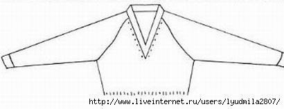 4. Свитер-реглан с V-образным вырезом. В этом случае нужны все расчеты по горловине, о которых говорилось ранее. Его начинают вязать как классический реглан, только с одной разницей: вдоль выреза горловины петли прибавляются в каждом 3 или 4 ряду в зависимости от того, насколько глубоким хочется сделать вырез. Так продолжают вязать прямыми и обратными рядами до тех пор, пока количество петель обеих полочек не станет равным количеству петель спинки минус 1 или 2. Набрав на спицы недостающие петли, замыкают вязание в кольцо и далее вяжут по кругу.