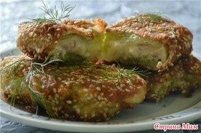 Обвалять сначала в муке, потом во взбитом яйце, а затем в паниров. сухарях с кунжутом. Обжарить на раст. масле до золотистого цвета.