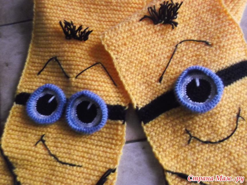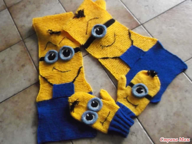 Попросила меня одна мамочка связать шарф и варежки "Миньон", шапочка у них есть. Прислала образец, на фото комплект связан крючком, но поскольку шапка связана на машине, то я вязала спицами, только глазки связаны крючком. Ниточка АЛИЗЕ СуперЛана, ушло 1,5 мотка желтой (шарф длиной 1,5м), синего даже пол мотка не вывязала, спицы №3. Главное пожелание что бы были волосики.