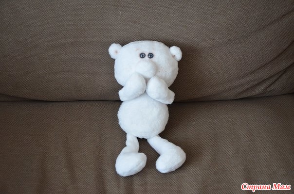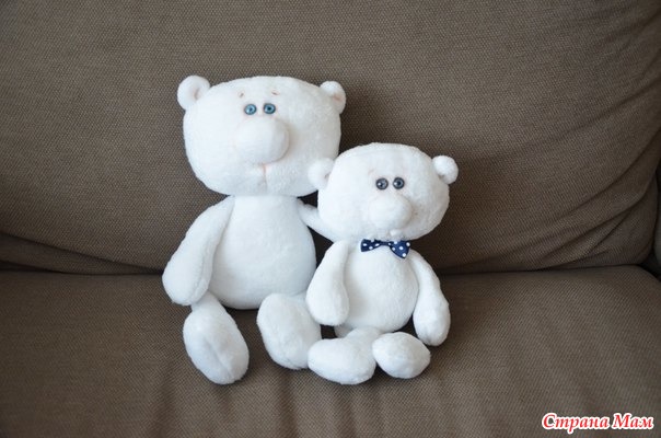 Всем Добрый вечер!!! Хочу показать Вам Мишек. Сшиты из белого, Очень мягенького меха. Они разного роста. Выкройка моя, что то напридумывала и вот. что получилось. Только у мишки, который побольше немного переделала туловище и головку.