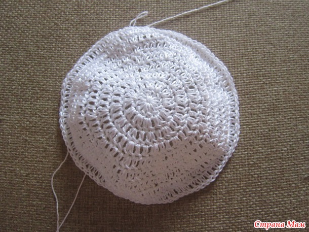 По краю от "ушка" до "ушка" в свою шапочку я вставила атласную ленту 0,7 см, немного присборила и завязала на куколке.
