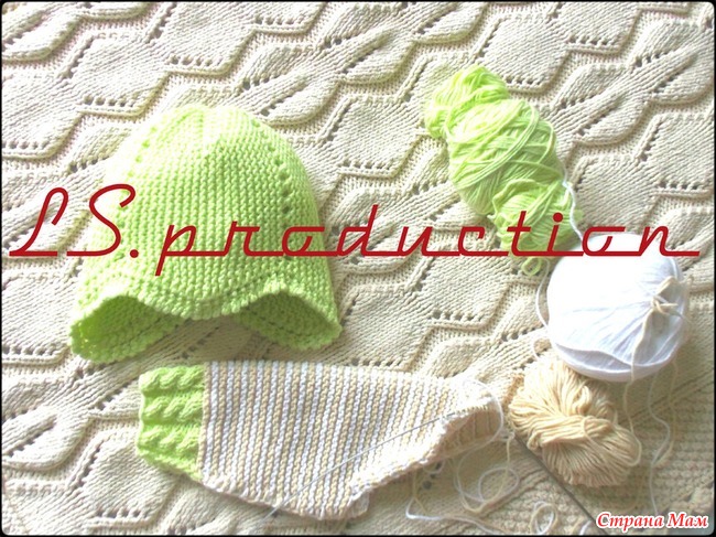 Шапочка и все что цвета зеленый салат - это неопознанный 100-граммовый красивый моточек, доставшийся мне на стоке турецкой пряжи в прошлом году ( у меня много таких беспризорных моточков приютились). По составу на ощупь ниточка похожа на хлопок с бамбуком.