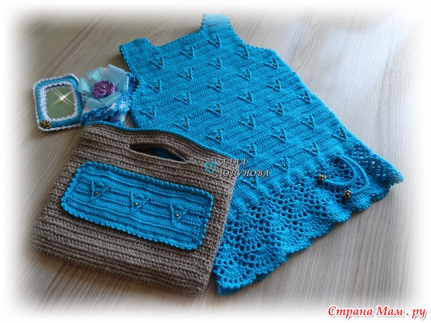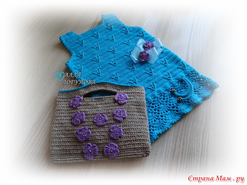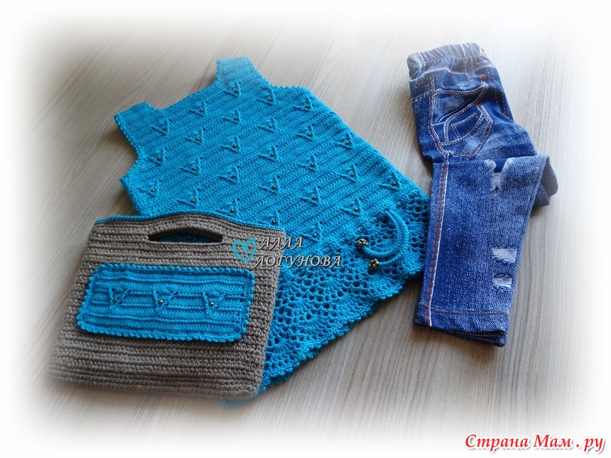 Расход пряжи на тунику составил 110 г., крючок № 2. Сумка связана из обычного акрила.