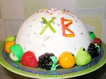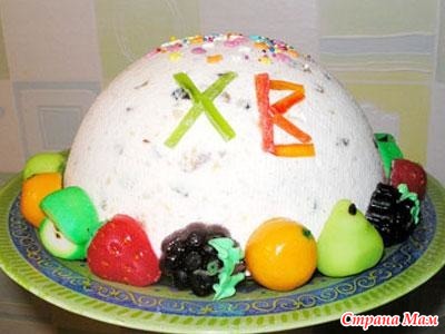 Состав: 450 г сливочного масла, 5 желтков, 500 г сахара, 1 кг творога, 1 ч. л. Кардамона, щепотка ванилина, по 100 г изюма, миндаля и цукатов, 2 ст. л. тертой лимонной цедры, 300 мл сливок, 2 киви, 2 апельсина, зерна граната.
