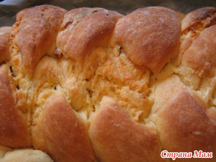 Развести дрожжи в ½ стакана теплого молока с 1 ч.л. сахара. В миску высыпать муку, добавить 1 ч.л. соли, оливки и ветчину мелко порубленные, размешать и вылить дрожжи. Начать замешивать, постепенно добавляя масло и теплое молоко, пока тесто не станет мягкой и эластичной консистенции. Разделить его на 3 части и раскатать их на жгуты. Сплести косу, соединить концы и полученное кольцо поместить с большую разъемную форму, смазанную маслом. Накрыть и поставить подниматься в теплое место минут на 40.