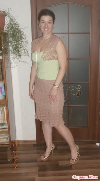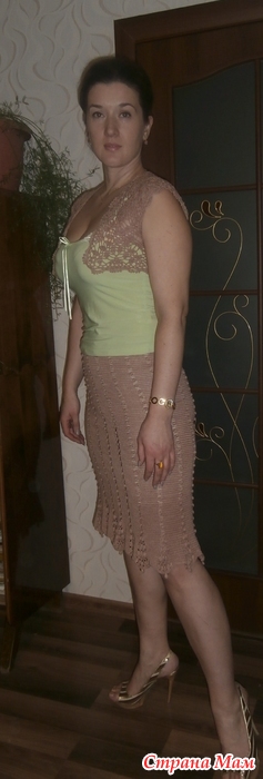 Юбочка из ЖМ из турецкого хлопка, тоже не помню нитку - не собирала раньше такую информацию. К этому комплекту связана еще маечка шоколадного цвета, но так как места в шкафу не хватает - зимой летние вещи живут на антресолях - не нашла...