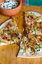 Tarte flambe, он же flammekuche, он же “пылающий пирог”, если переводить дословно, занимает в кухне Эльзаса то же место, которое пицца занимает в кухне неаполитанской. Правда, в отличие от своей итальянской родственницы, за пределами Эльзаса тарт фламбе не слишком известен: блюдо это крестьянское, как следствие – непритязательное. Лепешку с творожным сыром, луком и беконом готовили в Эльзасе тогда, когда печь еще слишком горяча и ставить в нее хлеб – напрасный перевод продукта, зато тарт фламбе испечется за минуту-другую. Именно по этой причине слегка опаленная корочка и прочие обгорелости – вполне ожидаемы и не свидетельствуют о том, что вы испортили блюдо.