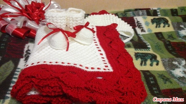 В ожидании племянницы связался вот такой комплектик. Плед связан крючком из пряжи elezir. Еще шапочка, пинетки из детского акрила. И в довершение проекта сделала бант из лент.