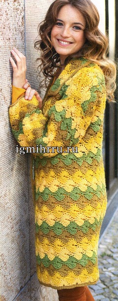 Вам потребуется: по 300 (350) г зеленой, оливковой, горчичной и желтой пряжи (100% натуральной шерсти; 80 м/50 г); крючок № 6 и 7; 4 пуговицы диаметр 22 мм прозрачного/оливкового цвета.