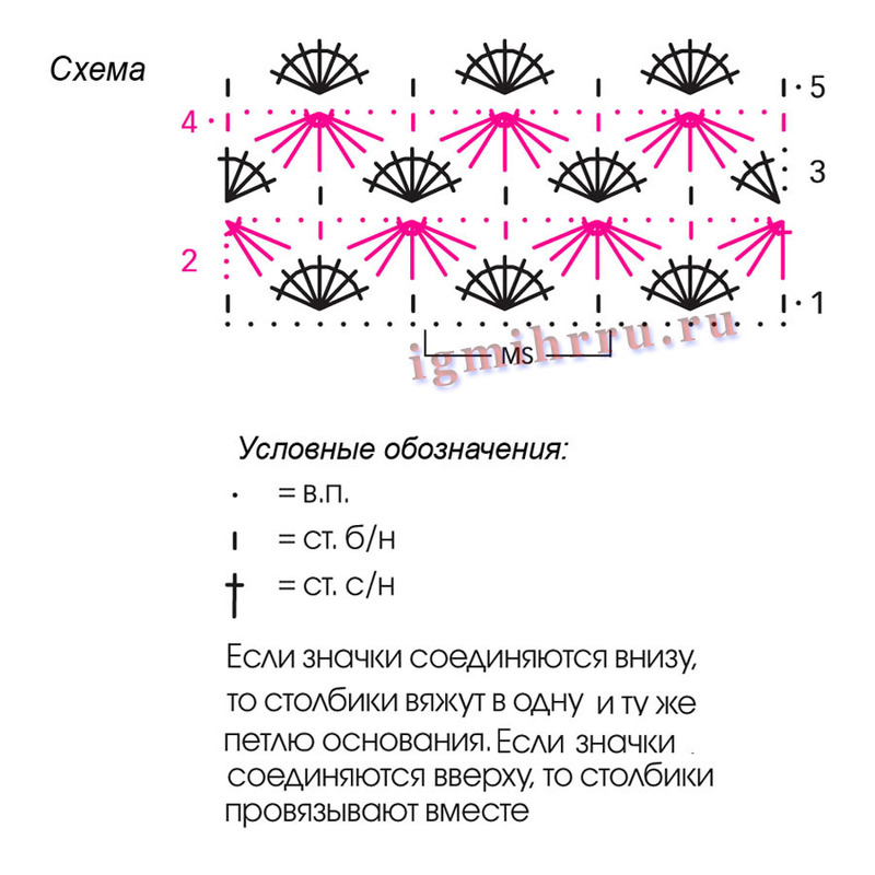 Основной узор: число петель начального ряда кратно 8 + 1. Вязать по схеме. Начать с петель перед раппортом, раппорт постоянно повторять, закончить петлями после раппорта. Выполнить 1 раз 1–5-й ряды, затем постоянно повторять 2–5-й ряды, соблюдая последовательность цветов.