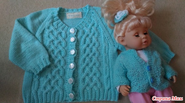 Только я вязала без швов, т. е. полочки и спинку вязала одним полотном, а рукава ввязывала сверху! Очень понравился такой способ вязки, удобно, что ничего не надо сшивать (не люблю прятать хвостики и шить не люблю!), а еще длину рукава можно довязать по мере роста малышки.