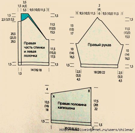 Для скосов прибавить с обеих сторон в каждом 6-м ряду 1 (3) 1 раз по 1 петле и в каждом 4-м ряду 3 (2) 6 раз по 1 петле.