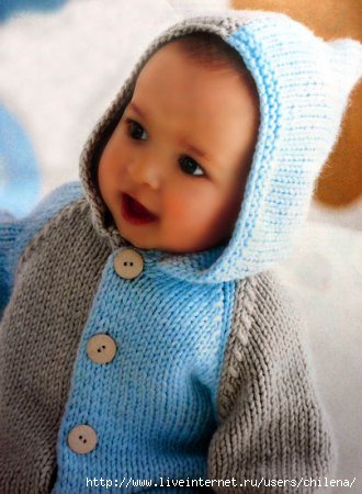 Вязать симметрично и голубой нитью, с левого края на расстоянии 2 петли от кромочной равномерно выполнить 4 (4) 5 отверстий для пуговиц.