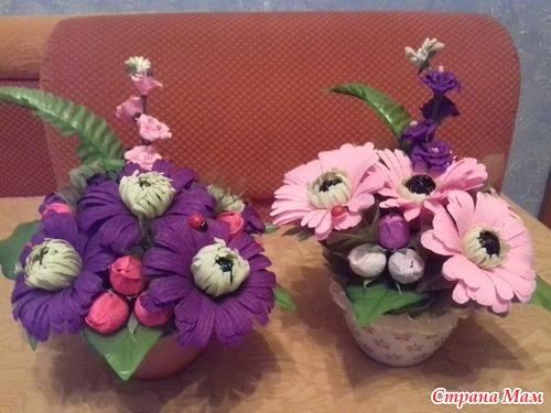 Так что это мои первые крупные букеты. Они все в цветочных горшочках. С конфетами "Марсианка".