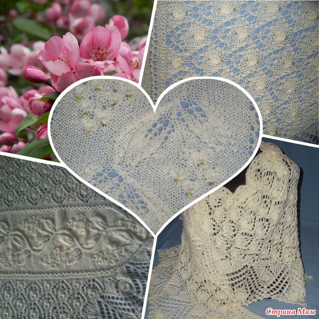 Принимала участие в тестировании шали Аллы Борисовой под названием Райские яблочки. Очень нетрадиционная для шали форма:Не треугольная, не полукруглая. Вяжется отдельными этапами. Сначала центральный фрагмент. потом боковые фрагменты шали. Последней вяжется кайма. Весит шаль 210 гр. вязалась из довольно толстой пряжи 380 м в 100 гр.