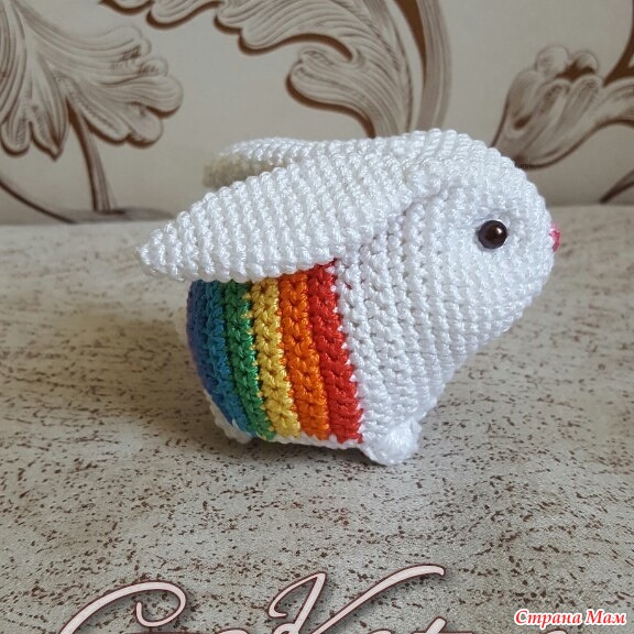 Зайка связан из кировского ириса в пасмах крючком номер два. Вязала в две нити. Глазки бусинки. Автор американка Наталья, описание продает.