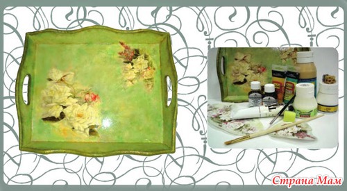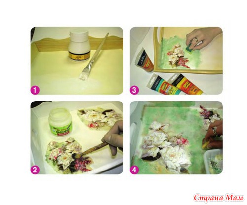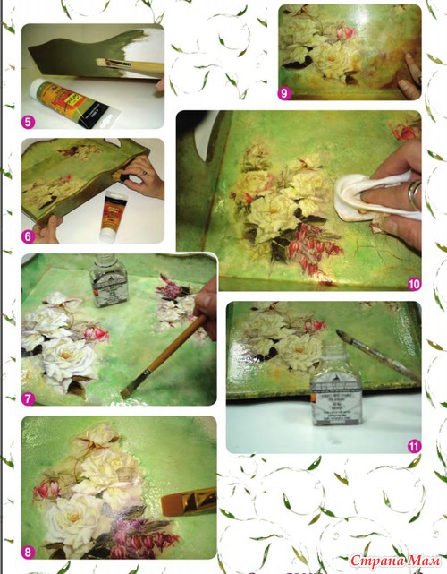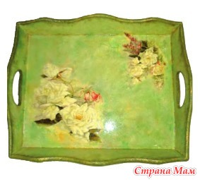 1. Грунтуем поверхность подноса акриловым грун¬том три раза, давая каждому слою высохнуть Не забываем после высыхания первого слоя грунта зашкурить поднос тонкой шлифовальной бума¬гой. Вместо третьего слоя грунта можно нанести белую акриловую краску.