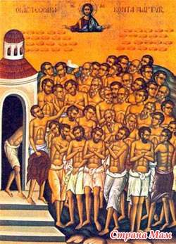 Стояла зима, был сильный мороз. Святых воинов раздели, повели к озеру, находившемуся недалеко от города, и поставили под стражей на льду на всю ночь. Чтобы сломить волю мучеников, неподалеку на берегу растопили баню. В первом часу ночи, когда холод стал нестерпимым, один из воинов не выдержал и бросился бегом к бане, но едва он переступил порог, как упал замертво. В третьем часу ночи Господь послал отраду мученикам: неожиданно стало светло, лед растаял, и вода в озере стала теплой. Все стражники спали, бодрствовал только один по имени Аглаий. Взглянув на озеро, он увидел, что над головой каждого мученика появился светлый венец. Аглаий насчитал тридцать девять венцов и понял, что бежавший воин лишился своего венца. Тогда Аглаий разбудил остальных стражников, сбросил с себя одежду и сказал им: "И я - христианин!" - и присоединился к мученикам.