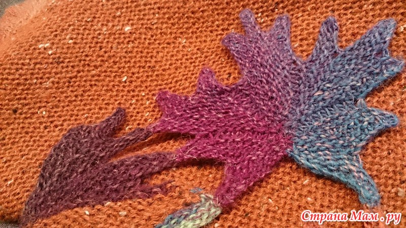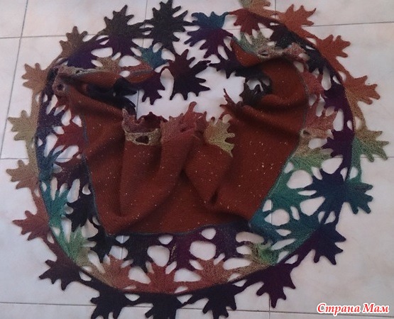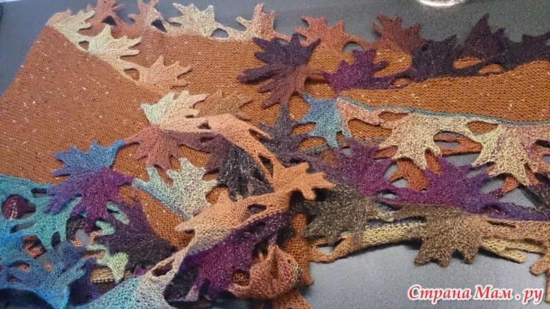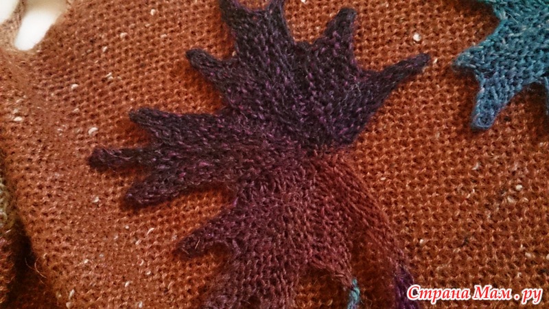 )Листочки связаны из Garnstudio DROPS Delight, цвет 10 Olive Rust Plum. Тело шали из Alpina ALPACA TWEED, цвет Brown, в 2 нити. Спицы 2,25. Размер 210 см на 55см. Листочки по верхней части шали связаны только половинки.