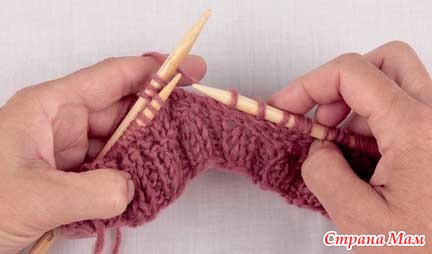 Провязать 3 лицевых, 3 петли со вспомогательной спицы лицевыми, 4 изнаночных, 6 лицевых. Повторять от * до *, но петлю со вспомогательной спицы провязывать, чтобы была с лицевой стороны лицевой.