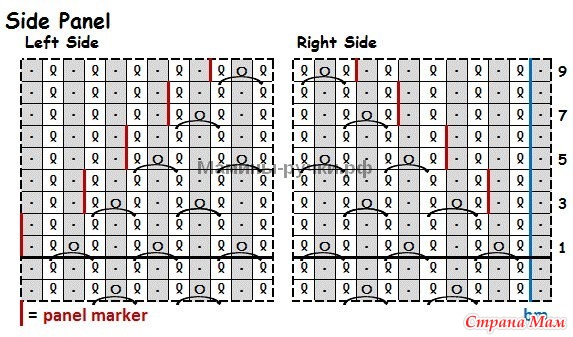 Круг. р. 3 (3-й ряд боковых панелей): *1 лиц. скрещ., 1 изн., пм (маркер панели), вязать сеткой до 3 п. перед м (начав с узелка), пм, 1 изн., 1 лиц. скрещ., 1 изн., ум, [1 лиц. скрещ., 1 изн.] до м**, ум; повторить от * до **.
