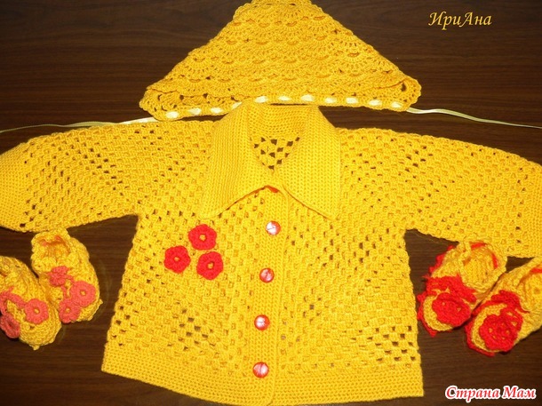 Вот такой цыплячий набор я вязала просто потому, что захотелось попробовать кофточку таким способом, а к ней добавилось в комплект. Теперь лежит, ждёт своего цыплёнка. Пока не обещают.