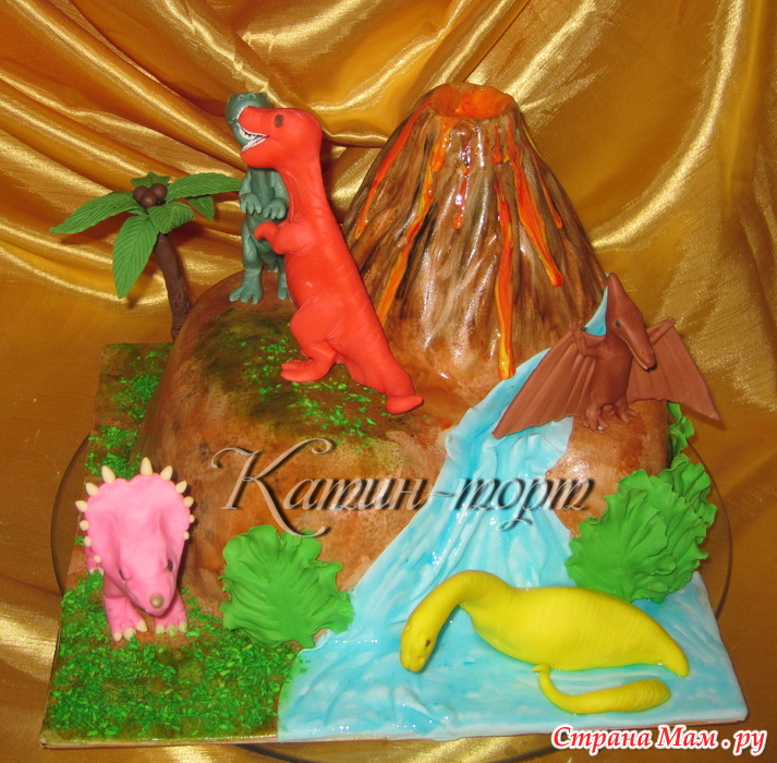 Торт заказали малышу, который в динозаврах разбирается гораздо лучше, чем вся моя семья. Но по какой-то неведомой причине, малыш захотел динозавров именно этих разновидностей, и вот таких странных цветов. А еще на торте должен был быть вукан. Внутри птичье молоко в шоколадном бисквите. В вулкане шоколадный торт. Вес торта 5 кг. И вот, что из этого вышло...