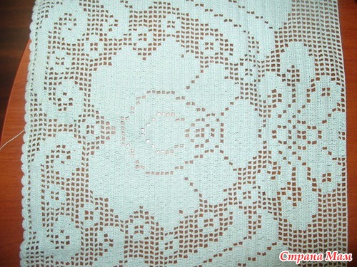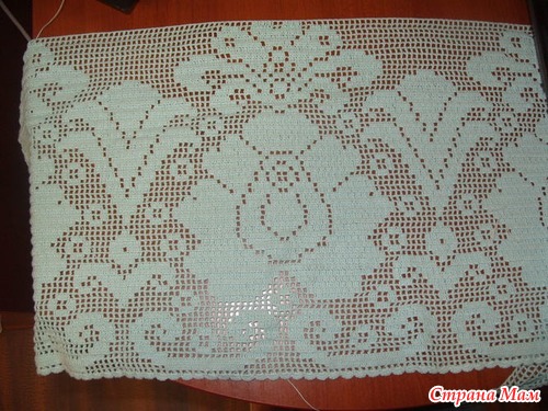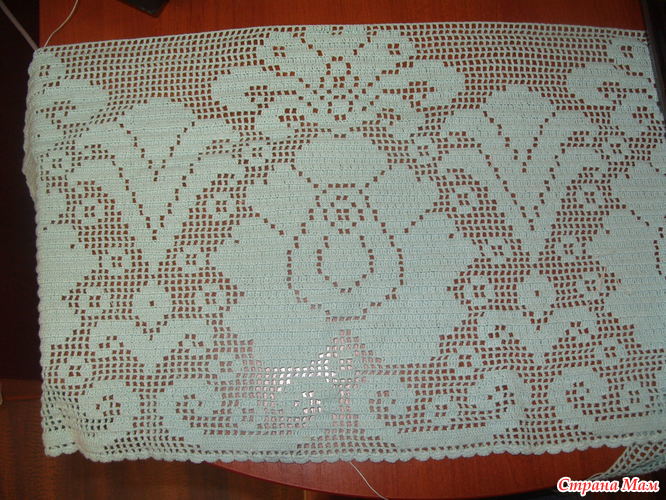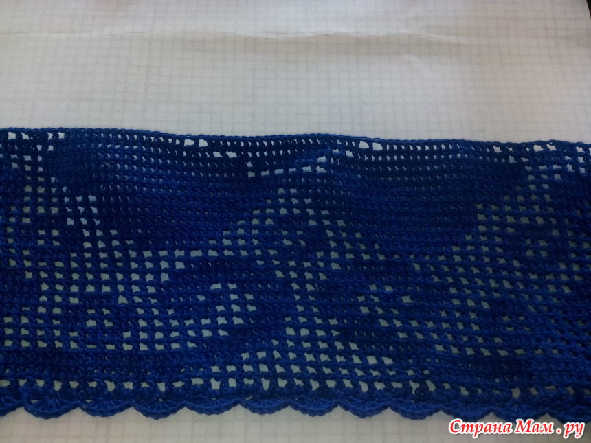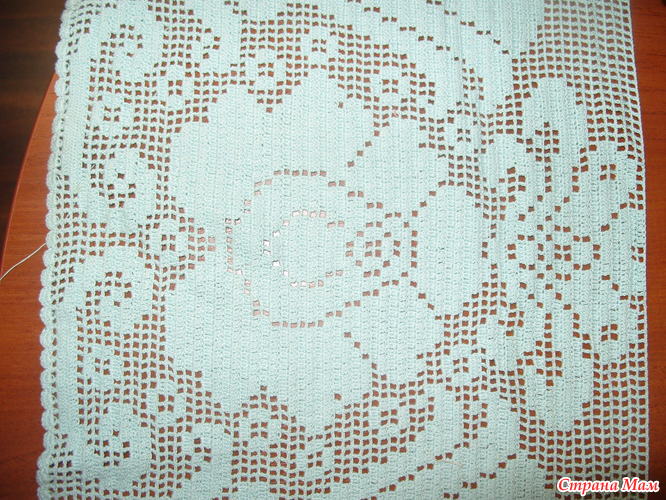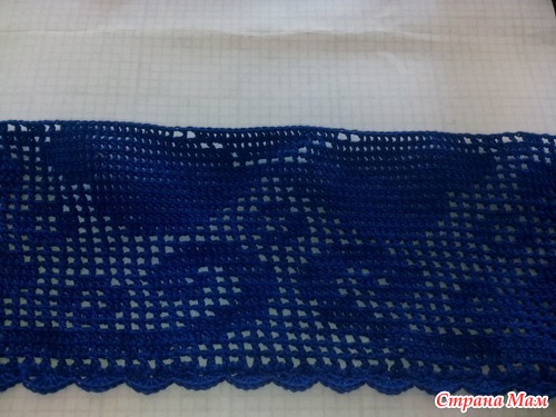 Набрала 5 раппортов по 53 клетки. Наборный ряд от одного мотка и сразу на нем столбики с. н. от другого. Обвязала веерками по 6 ст. с. н. Ширина получилась около 2 метров. Осталось запастись огромным терпением и внимательностью. Удачных клеточек участницам )). Если что-то забыла, исправлюсь ))