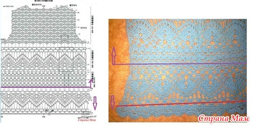 Попытаюсь так: От сиреневой линии вверх ( от первого ряда).Затем , после сшивания деталей вниз ажур ( от сиреневой линии до красной.И сразу же обвязка низа от красной линии.