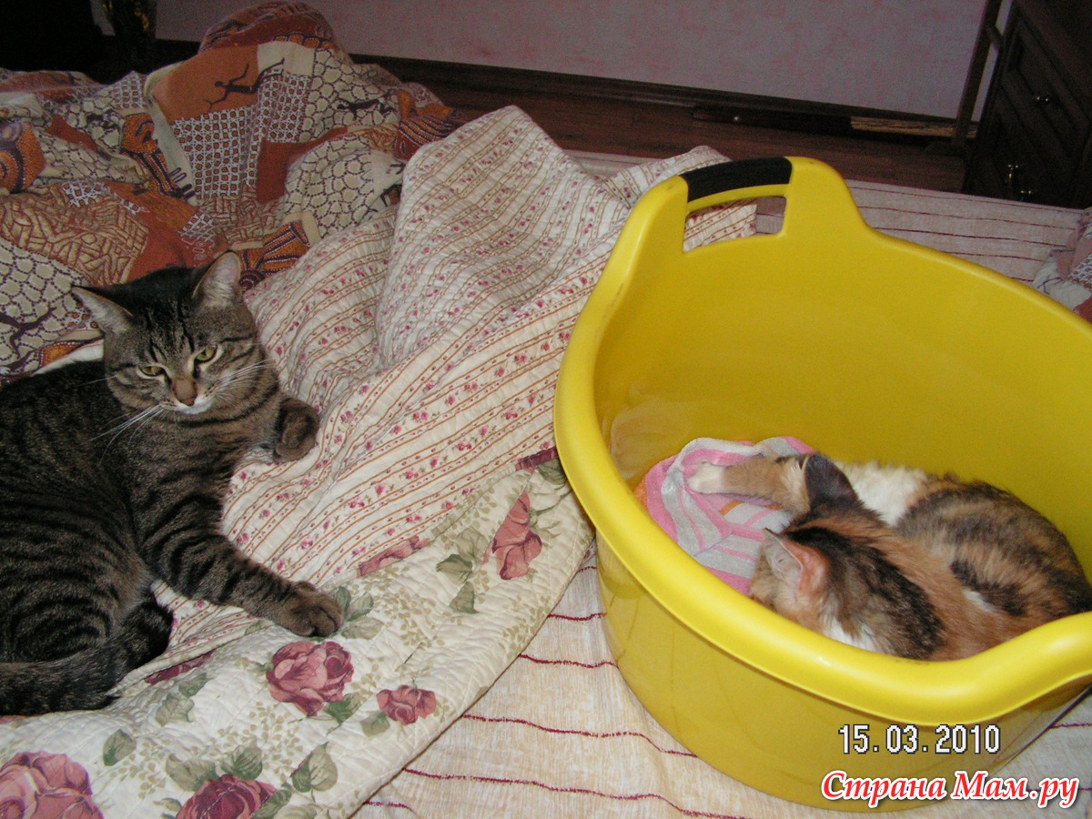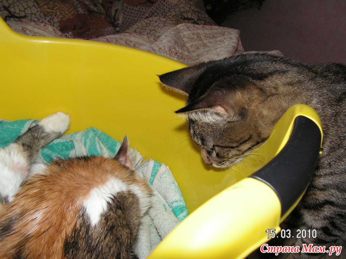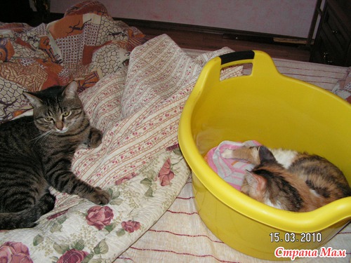 хозяйка начинает гладить животик, потуги и все ждут! За мою жизнь это вторая кошка, первая прожила с нами 20 лет, и все роды я была рядом, ночь-полночь, сижу и помагаю. Всегда кошки рожают в тазике, и им спокойнее и мне не бегать не искать, куда котят запрятала, вот и молодая первые роды металась, а я возьми и в таз ее, все прошло нормально.