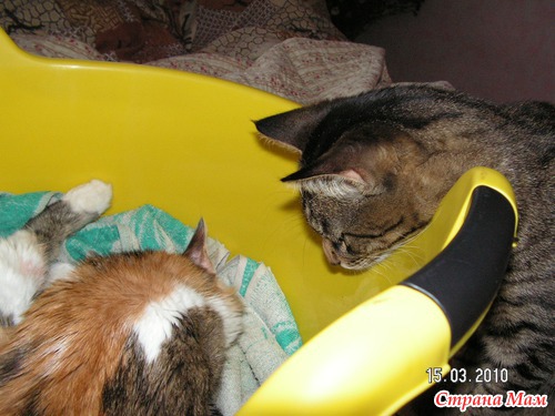 Послед пес помогал "убирать", потом сторожил котят, никого не подпускал к ним, когда кошка поесть или по нужде уходила, фотки у меня в альбоме про змое зверье есть,а сегодня у него амурные дела, он на улице бегает, так что нас трое, мамаша, кот и я.Что получится напишу отдельно.