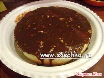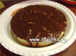 Выпекать 65 минут в режиме "выпечка". Вытаскиваем чизкейк следующим образом: ставим чашу для пароварки на кастрюльку, затем кастрюльку переворачиваем аккуратно, чизкейк оказывается на пароварочной чаше. Затем ставим сверху блюдо и ещё раз переворачиваем.