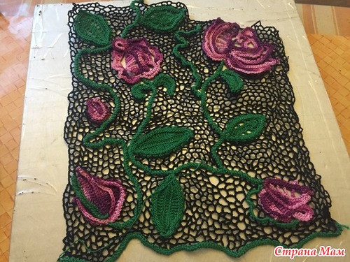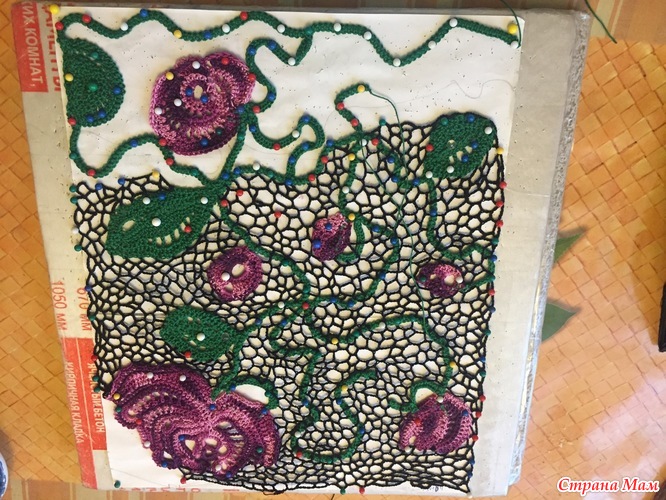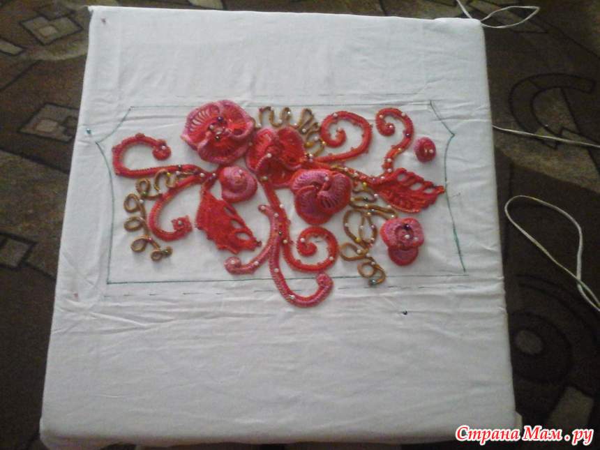 1. Первый вариант - это что то вроде планшета. Покупаете в магазине поролон, шьете чехол на него съемный с молнией, потом кладете на любую твердую поверхность, кладете на него выкройку, прикрепляете английскими булавками (иголочки с шариками или петелькой вместо обычного ушка) мотивы заранее отпаренные, НО ИЗНАНОЧНОЙ СТОРОНОЙ ВВЕРХ, чтобы не было видно мест соединений с сеткой.