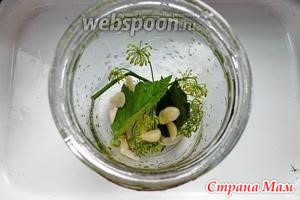 В чистую банку кладём укроп, листья смородины и вишни, чеснок.