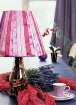 Берем старый надоевший абажур и превращаем его в стильный предмет интерьера, обтягивая разноцветными шелковыми лентами. Вертикальный рисунок - самый удобный для исполнения. Наносите клей на края лент и подклеивайте края под проволочный каркас изнутри абажура. По длине ленты клей наносить не надо.