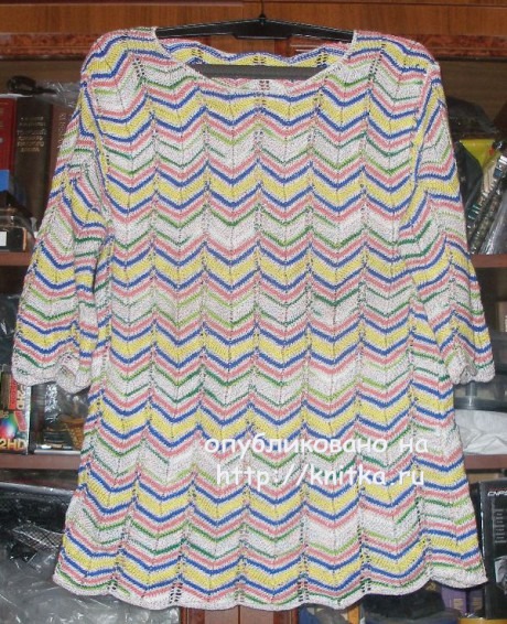 Цветная летняя кофточка. Связана из тонкого хлопка разных фирм, узор – зигзаг. Размер изделия 56-й. В условных обозначениях к схеме воздушная петля – это обычный накид.