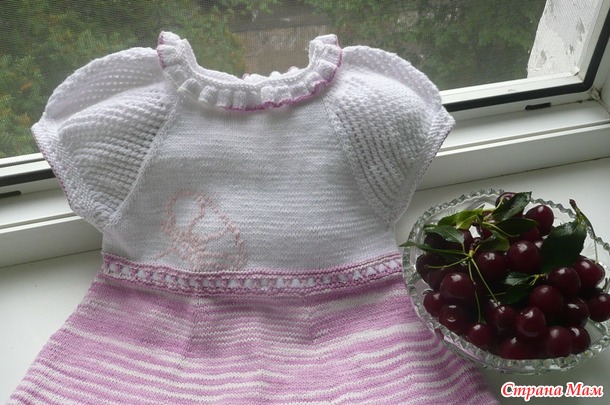 Хочу с вами поделиться своей очередной работой. Конечно же это платьице для моей внученьки. На этот раз вязала как говорится "с головы". Брала ниточки хлопок Полёт производителя ООО фирмы "Камтекс". Состав пряжи: хлопок - 100%, длина нити 400 м. Спицы № 3. Хочу отметить, что они чуть линяют. Ушло чуть больше 200 гр. Почти по 100 гр. белой и меланжа.
