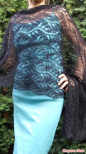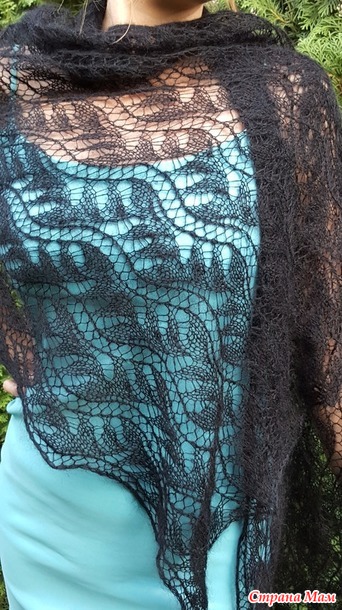 У меня готов еще один палантин. Теперь в черном цвете. Пряжа итальянский супер кид мохер70%+нейлон30%. 1100м/100гр. Вес палантина 75 гр. Размер 75х170 см. Спицы 3.5